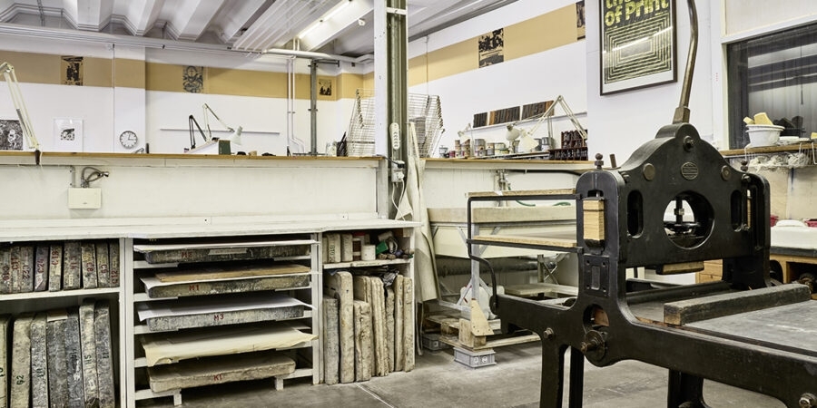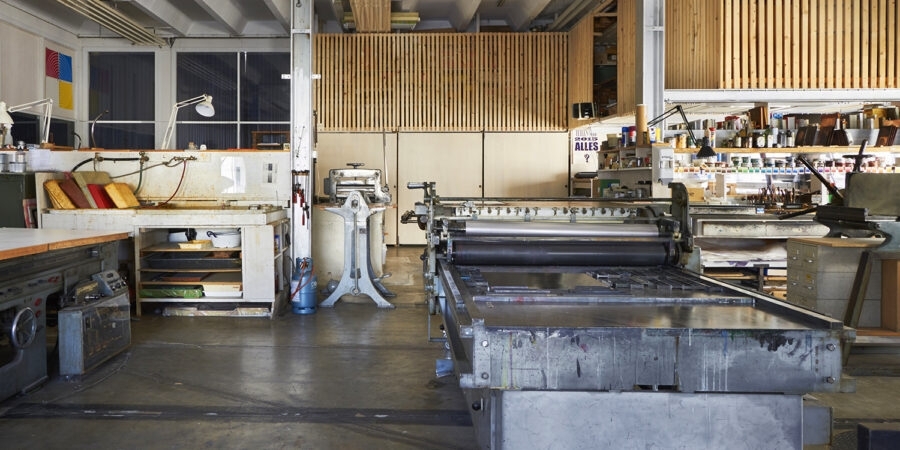 The printing works impart knowledge in wood and linocut, letterpress printing, etching techniques and lithography, develops commissioned works, is available to artists as a workplace and is open to all interested persons.